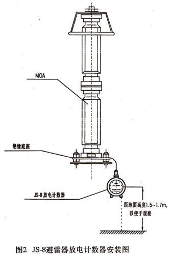 放電計(jì)數(shù)器上端接線端接避雷器絕緣底部,外殼的固定孔接地線。安裝圖如圖2所示: