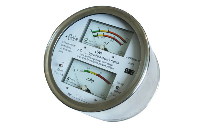 ??JSH-4型監(jiān)測器配有不銹鋼制作的屏蔽環(huán)及熱縮絕緣的引下線,瓷套外的漏電流通過監(jiān)測器瓷套的裙間金屬環(huán),導(dǎo)入內(nèi)中右側(cè)毫安表,毫安表中刻度是用反映污層電導(dǎo)率uS來表示的,它考慮了我國主要避雷器生產(chǎn)廠所用瓷套的爬電距離及絕緣子形狀因素。表的上層刻度適用普通瓷裙,下層刻度適用大小防污瓷裙。